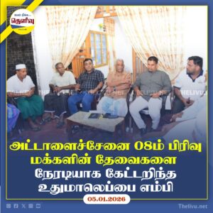 Read Moreஇலங்கையை நோக்கி நகரும் தாழமுக்கம் காரணமாக ஜனவரி 8 முதல் கனமழை, பலத்த காற்று மற்றும் கடல் கொந்தளிப்பு எதிர்பார்க்கப்படுகிறது.