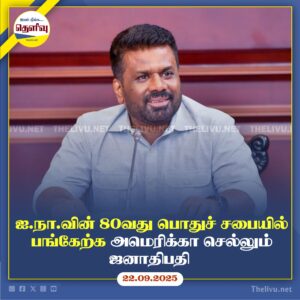 Read Moreஜனாதிபதி அநுரகுமார திசாநாயக்க அமெரிக்காவிற்கு விஜயம். ஐ.நா. 80வது பொதுச் சபையில் உரையாற்றவுள்ளார். உலகத் தலைவர்களுடன் பேச்சுவார்த்தையும் இடம்பெறவுள்ளது.