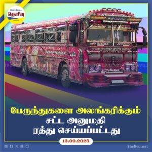 Read Moreபேருந்துகளை அலங்கரிக்கவும், பாகங்கள் பொருத்தவும் வழங்கப்பட்ட சட்ட அனுமதி சுற்றறிக்கை, 2025 செப்டம்பர் 9ஆம் திகதி முதல் ரத்து செய்யப்பட்டது.