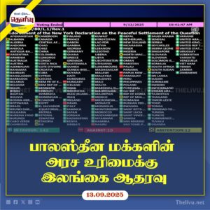 Read Moreபாலஸ்தீன இரு நாடுகள் தீர்வை ஆதரிக்கும் ஐ.நா. தீர்மானத்தை இலங்கை வரவேற்றது; 142 நாடுகள் ஆதரவு, 10 நாடுகள் எதிர்ப்பு தெரிவித்தன.